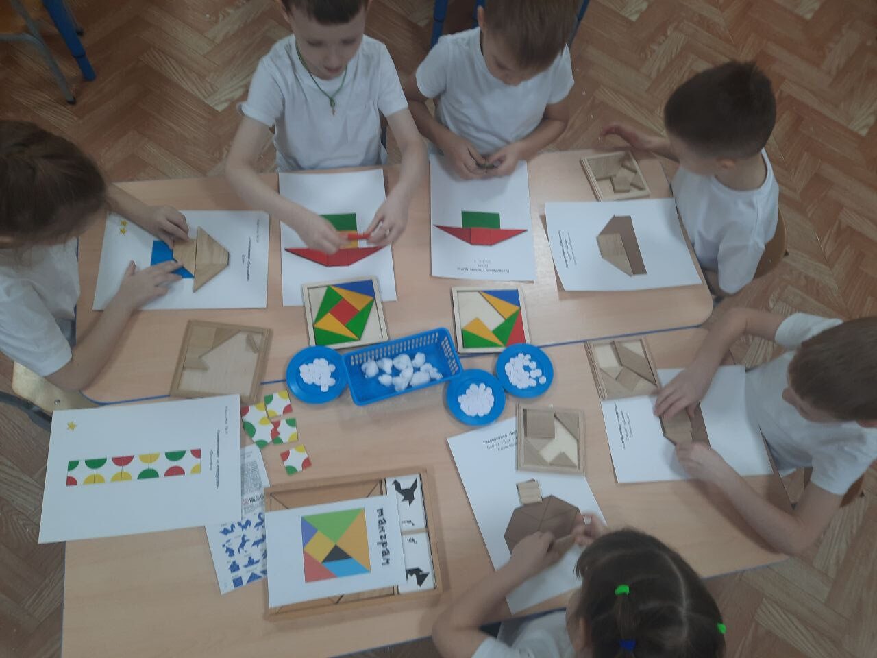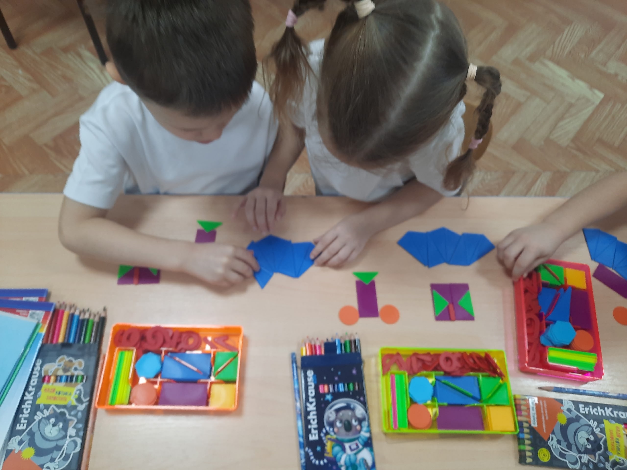 Создание положительного эмоционального фона занятия. Совершенствование умения узнавать и различать плоские геометрические фигуры, конструктивных навыков, ориентировка на плоскости. Ребята рассказали из каких фигур они собрали: шорты платье, юбку. Посчитали геометрические фигуры, проговорили детали одежды. Ребята с удовольствием создавали модели одежды!