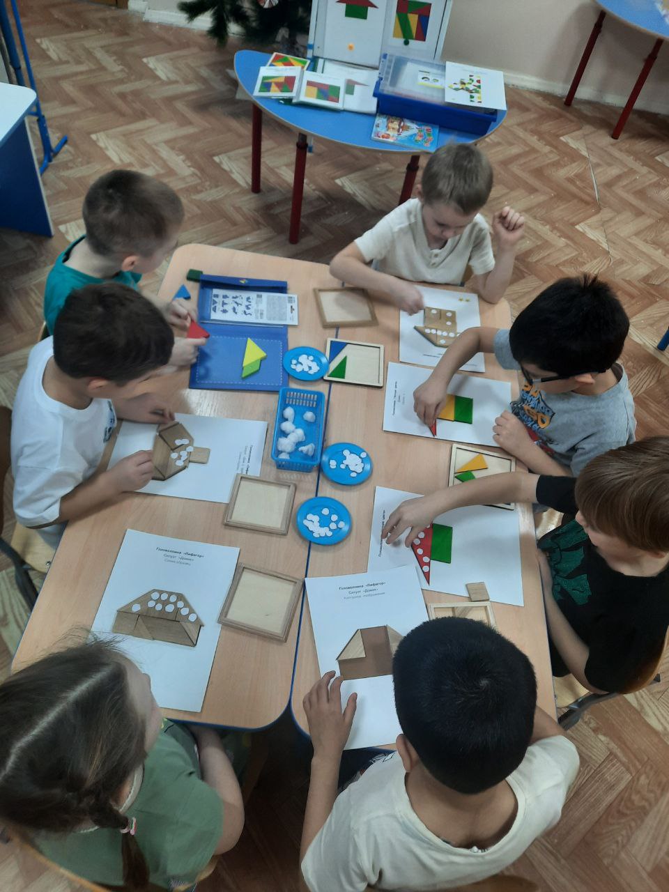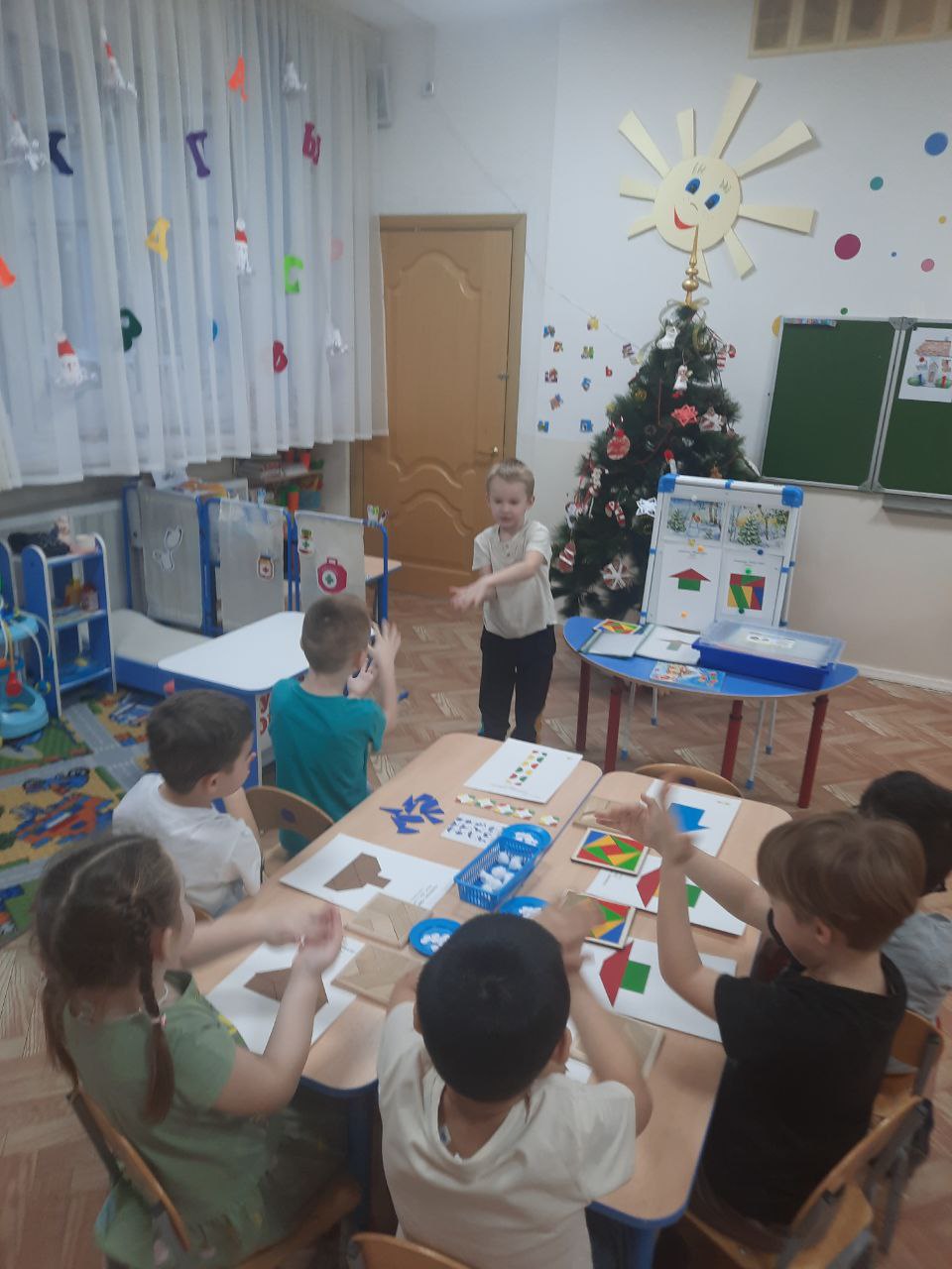 Ребята закрепили названия и детали головоломок, знакомились с новыми — » Пифагор», «Четыре цвета». Выполнили дыхательную гимнастику «Ветерок» (с помощью ваты), условие задание (собрать дом по схеме, выложить снежок на крышу), закрепили части дома. Ребята получили огромное удовольствие, когда построили великолепные заснежаные домики!